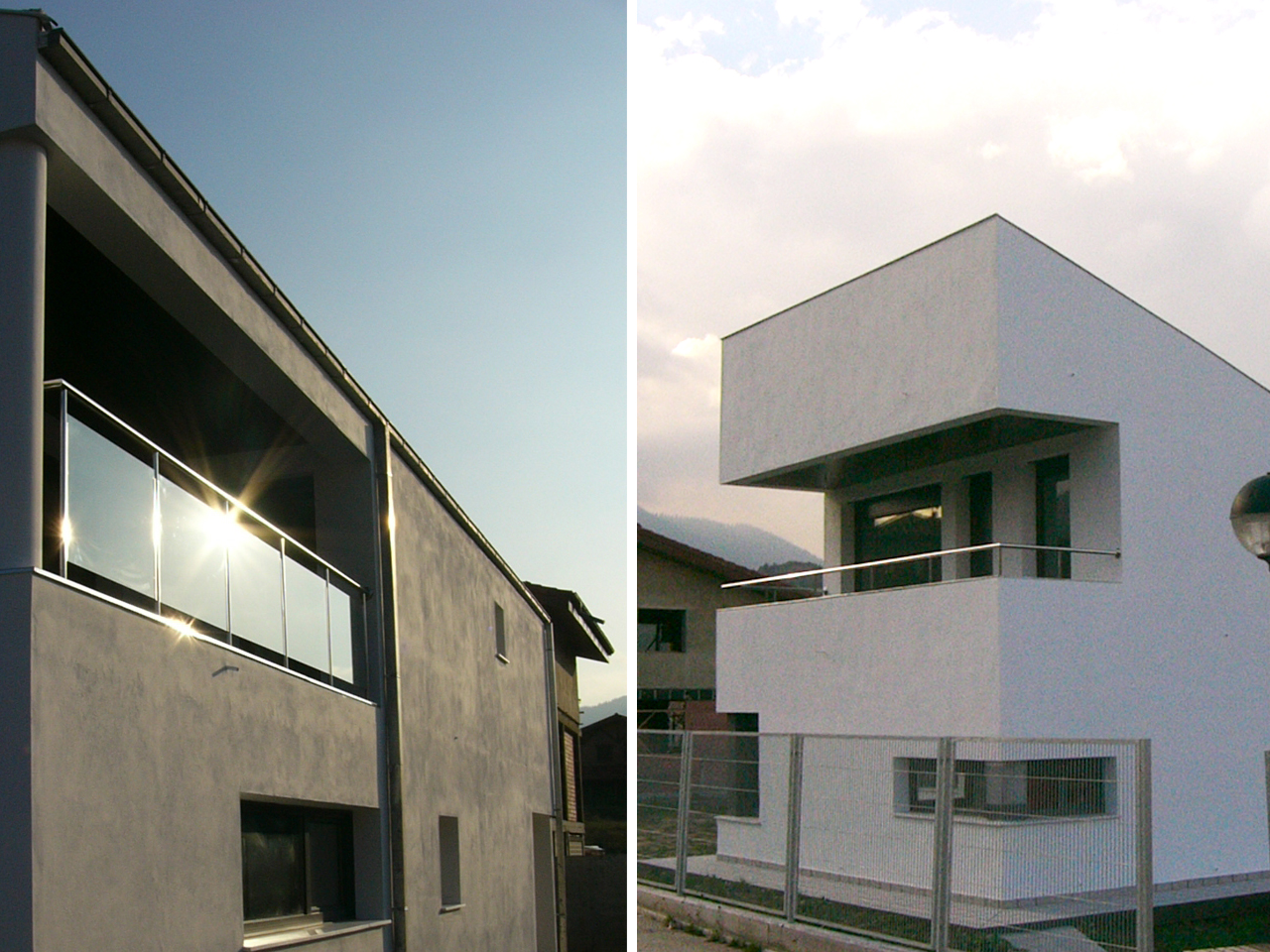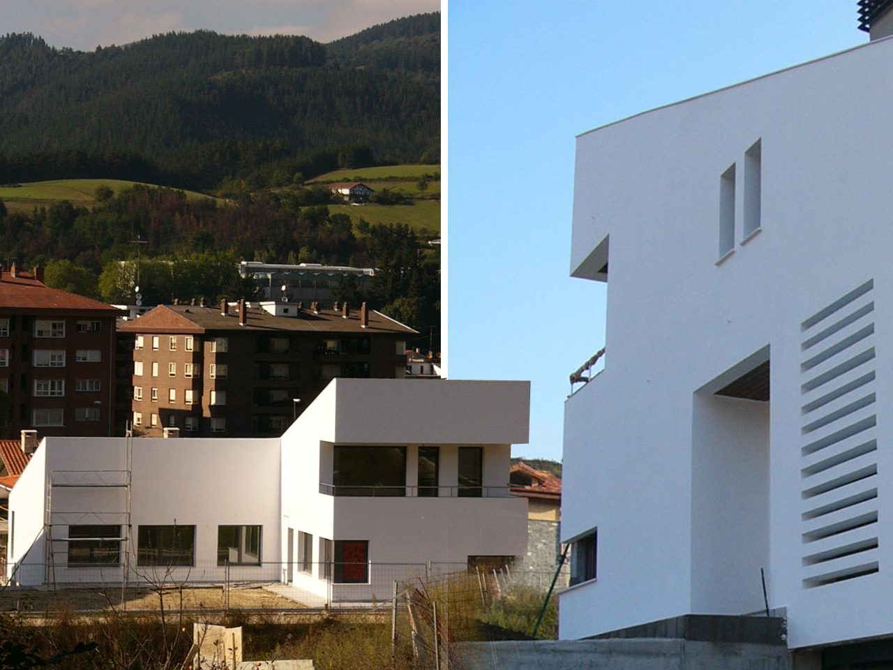 Además para adaptar la edificación al terreno, se ha aprovechado el desnivel existente para dividir la parcela en dos, longitudinalmente, con dos alturas en cada zona. Teniendo en cuenta que la diferencia de cota es de casi 2,60 m. entre el punto más bajo y el más alto de la parcela,  se utiliza la desnivel del vial que da servicio a la parcela para crear dos plataformas a distintas alturas, dos plataformas con tratamiento diferenciado. La plataforma inferior, que es la situada más al norte, es la de tratamiento duro, la que queda a nivel con el garaje y la bodega, y también con el punto más bajo del vial en la parcela. La plataforma superior es la ajardinada, la de acceso peatonal, la que se relacionará con el salón. Entre ambas plataformas, un muro de hormigón tratado que es el que divide la parcela y el que permite el salto de altura.