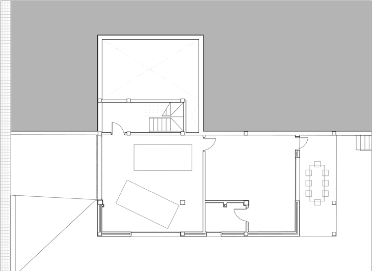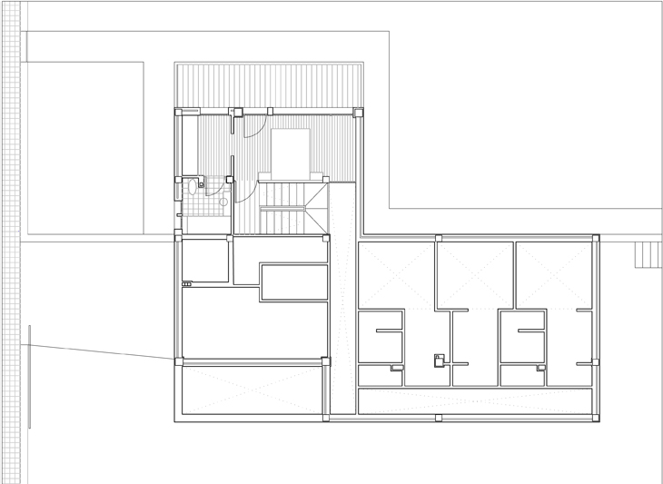 Sobre la plataforma superior, se sitúa el salón y sobre él la habitación principal con una terraza cubierta, que abre la habitación al sur y al este y la protege de la cercanía de los vecinos.