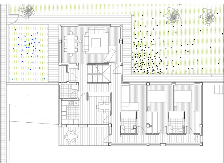 Sobre la plataforma inferior, se sitúan el garaje y la bodega (sin distribuir, aunque con todas las tomas previstas para situar un aseo y una cocina), y sobre éstos la cocina (con una terraza iluminada desde la cubierta con un lucernario), despensa y office, y las tres habitaciones de planta baja, que vierten sin embargo al sur, al jardín.