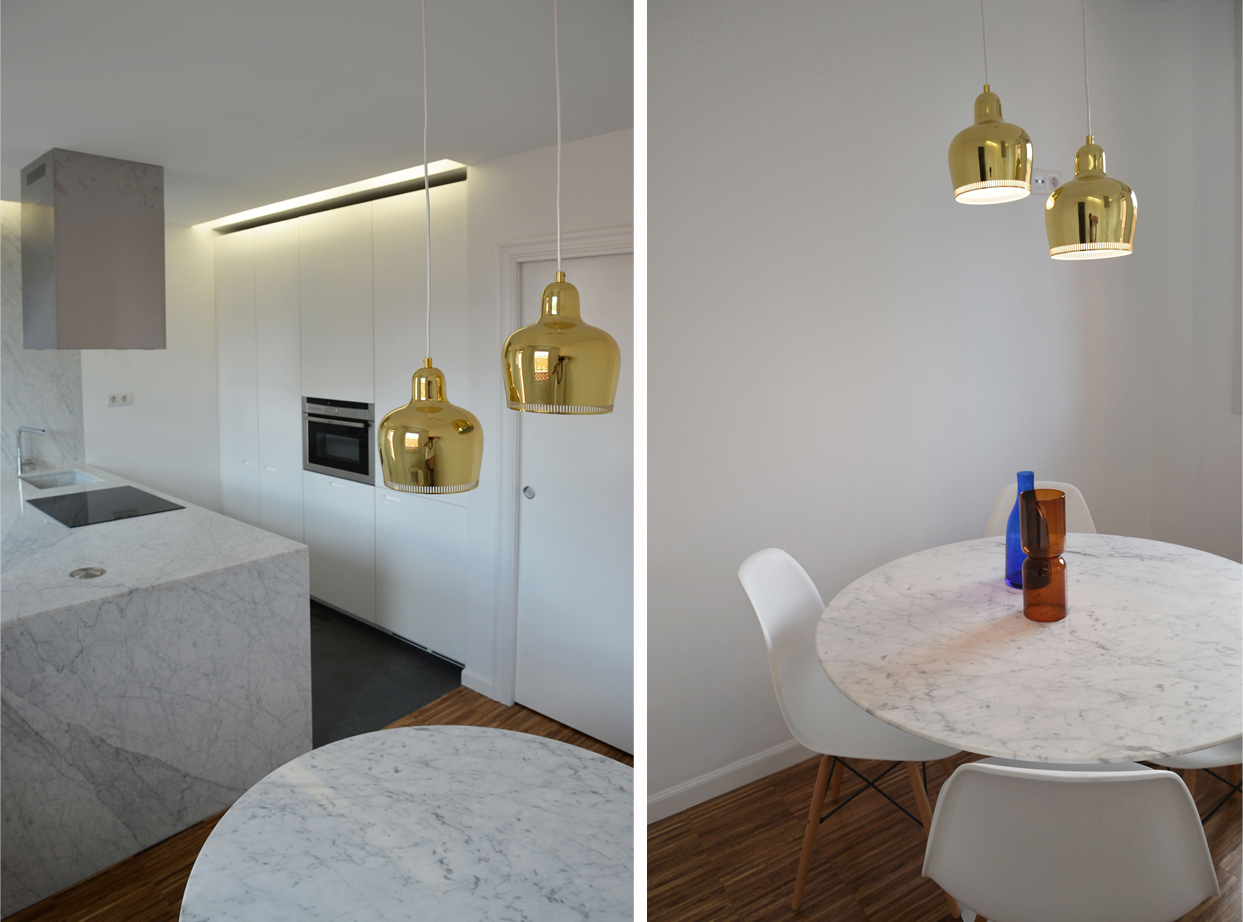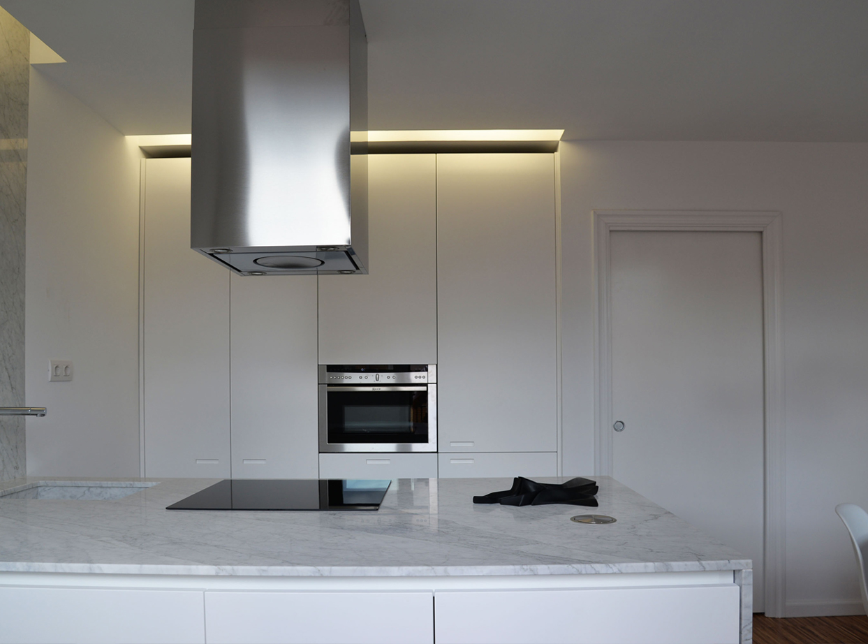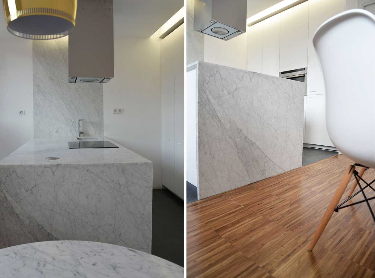 La cocina se divide en dos espacios, con dos suelos diferentes, el espacio de cocción y la zona de comer. El espacio de cocción se proyecta a su vez en otros dos espacios, los muebles altos, que quedan ocultos en el tabique; y la península, cubierta de una generosa encimera de mármol Carrara que sube por la pared y baja hasta el suelo.