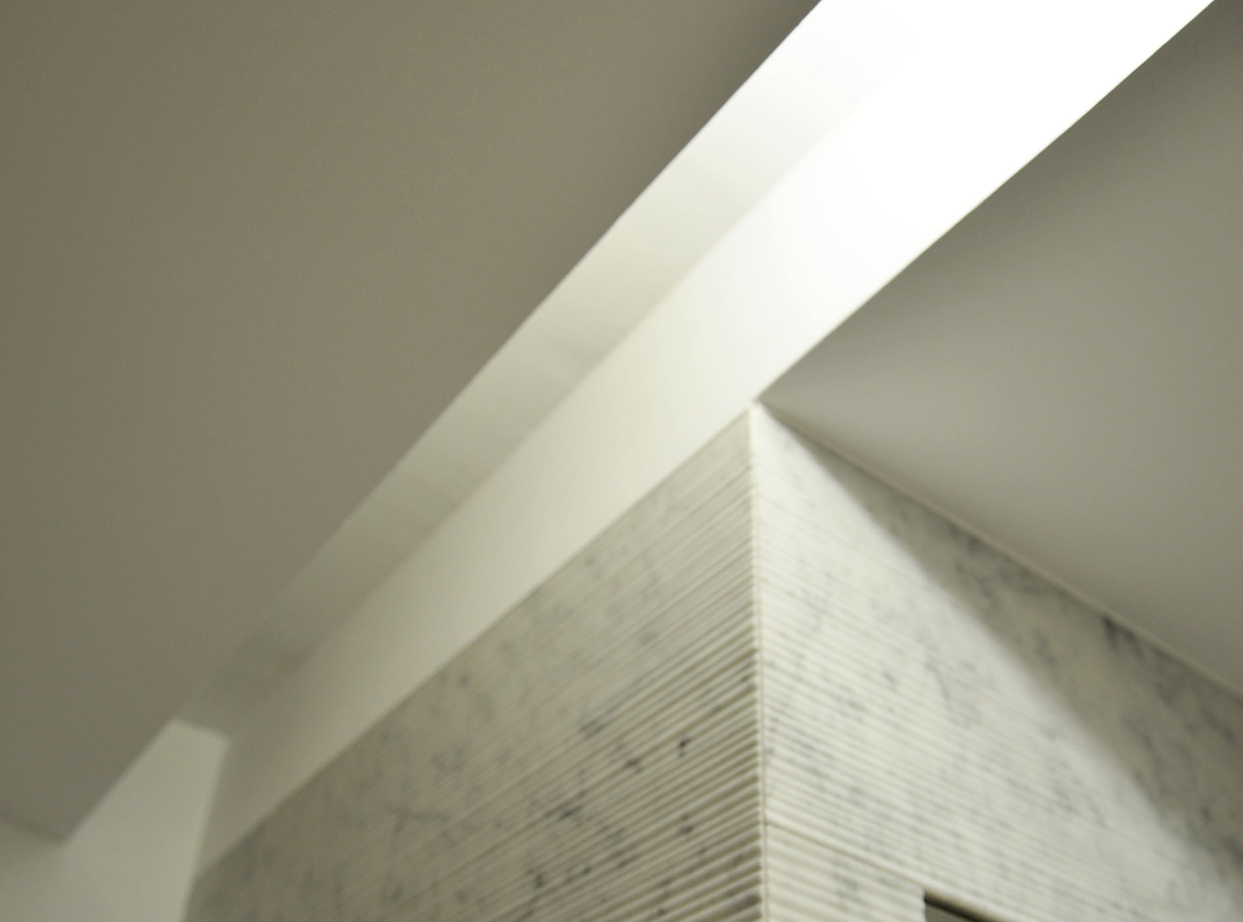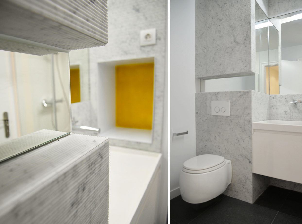 En los baños el mármol se presenta texturizado, con placas de Salvatori en su modelo Bambú, solo en los frentes. El resto se deja en blanco, tanto yeso pintado o grandes baldosas invisibles. Los sanitarios, de gran calidad, son de Ágape.
