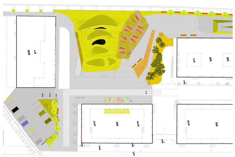 El resto de la urbanización plantea la misma solución de suavizar la imagen de la plaza y sus recorridos, tanto peatonales como ciclables o rodados. Cada una de los nuevos usos planteados (juego infantil, zona de juego juvenil, pipican) se identifican por una especie arbórea distinta y por un pavimento también diferente. La vegetación y pavimentos definen los recorridos naturales sobre un pavimento único general para todo el ámbito.