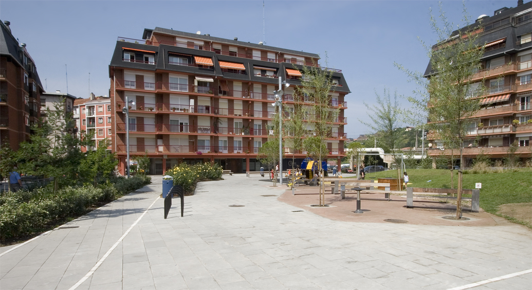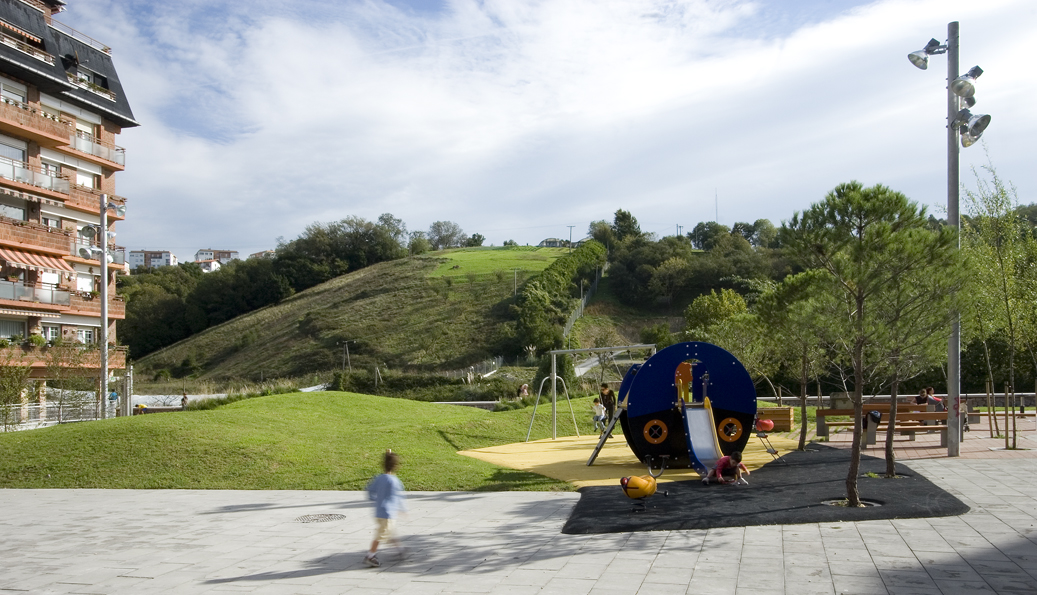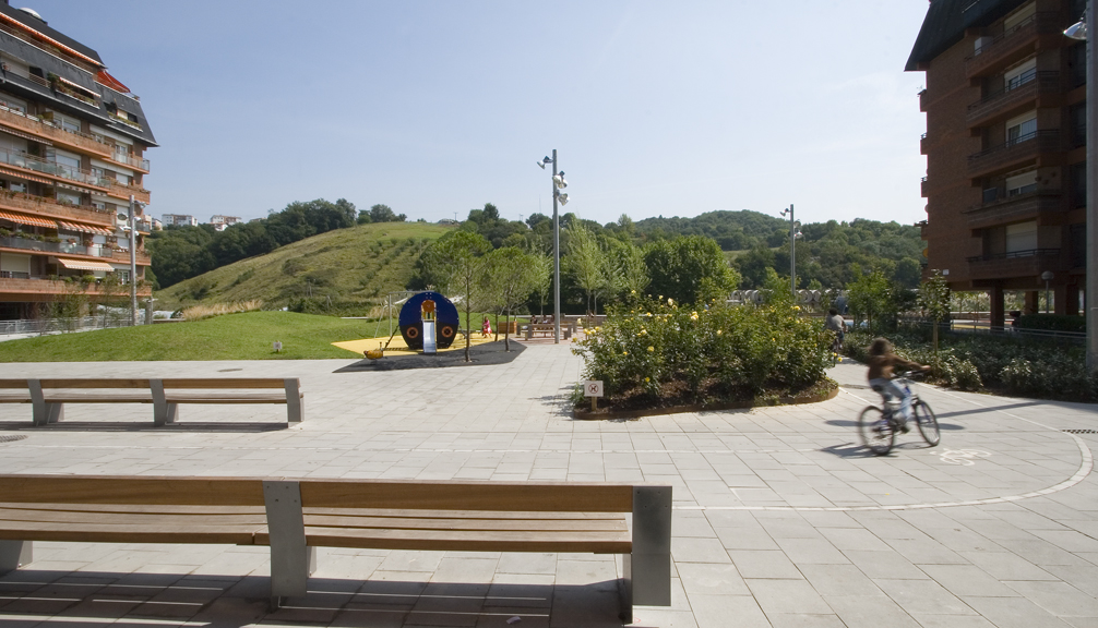 En la ribera del río Urumea en el barrio de Loiola, se plantea la reurbanización de una plaza surgida de la edificación de viviendas en los años 80. Hasta ese momento era una plaza dura, de espaldas al río, un río con dos vertientes claras, la urbanizada por un lado y la natural en la otra orilla.