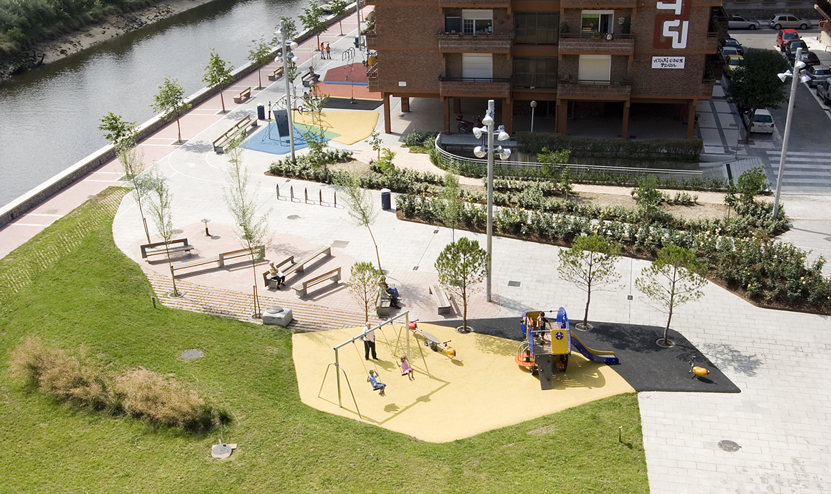 Se crea una loma artificial (que servirá además para ocultar el tanque de tormentas), con césped y vegetación ribereña, desde la que se podrá disfrutar del río, que ahora se ocultaba.